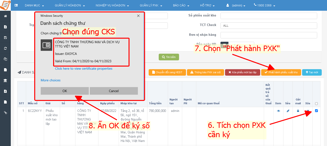 <figure><img src="https://2582414113-files.gitbook.io/~/files/v0/b/gitbook-x-prod.appspot.com/o/spaces%2F9Cf5Y4kybg88JAWwlOqb%2Fuploads%2Fyu3K7lsRlt34MOgIkiPO%2Fimage.png?alt=media&#x26;token=3bb4cd35-4496-4760-a20f-8421afa4dd11" alt=""><figcaption><p>Bước 4: Kiểm tra lại thông tin PXK trước khi ký</p></figcaption></figure>